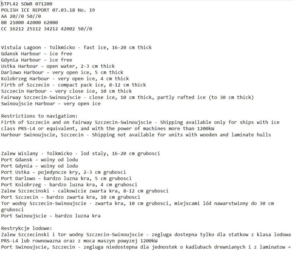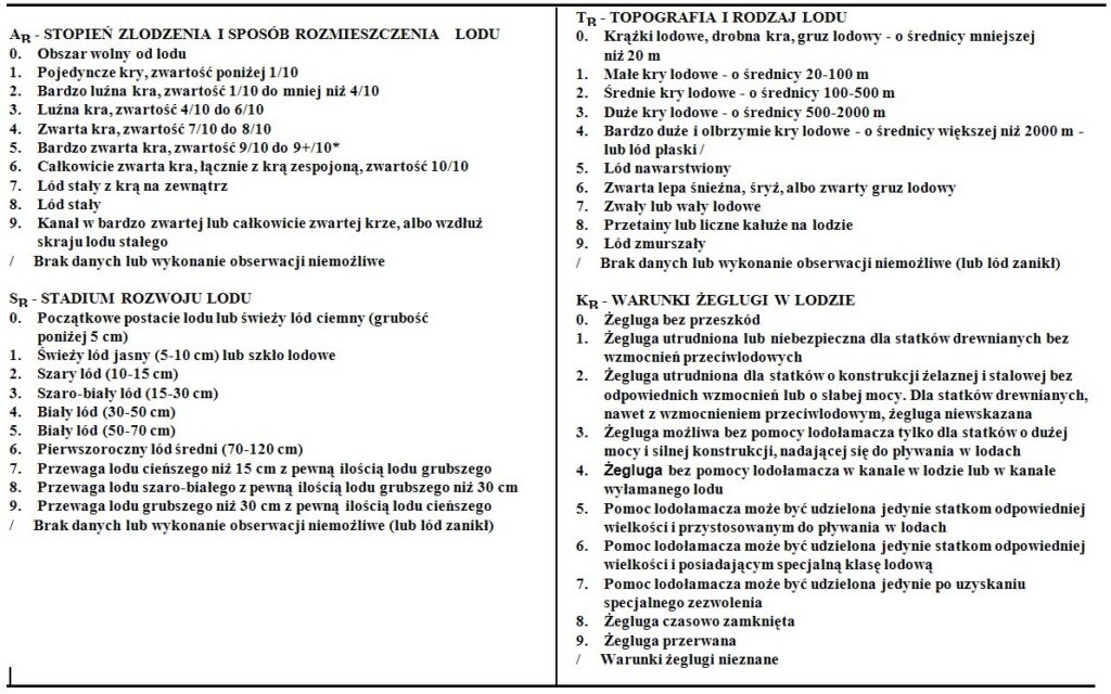 To sposób przekazywania informacji o zlodzeniu portów, torów wodnych oraz wybranych obszarów przybrzeżnych i odcinków tras morskich. Warunki lodowe każdego obserwowanego obszaru opisane są grupą pięciu cyfr: pierwszą jest identyfikator obszaru obserwacyjnego, kolejnymi – stopień zlodzenia i sposób rozmieszczenia lodu (AB), stadium rozwoju lodu (SB), topografia i rodzaj lodu (TB) oraz warunki żeglugi w lodzie (KB).