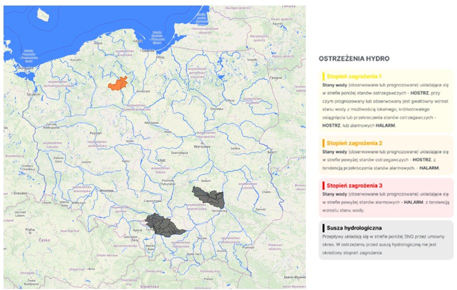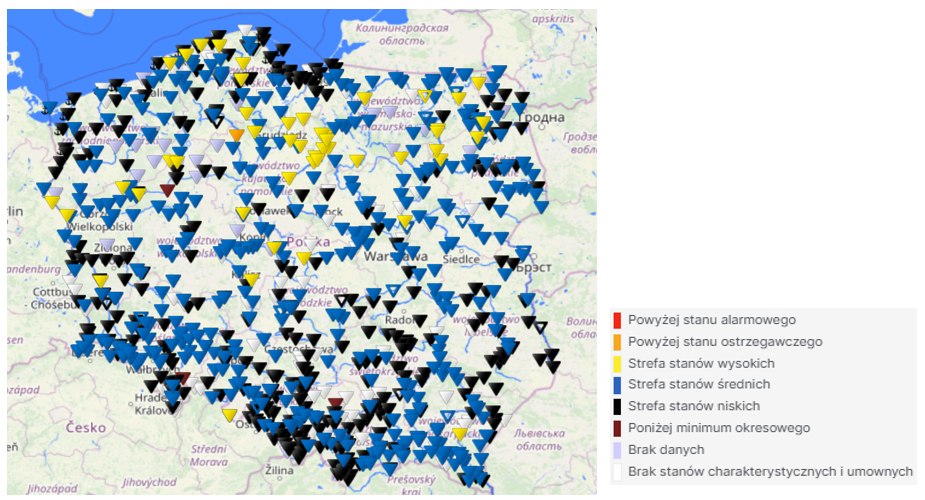 Na rzekach w Polsce stan wody układa się przeważnie w strefie wody średniej (49% stacji hydrologicznych), niskiej (45%) i lokalnie stan wody wysokiej (6%) (Rys. 1). Obecnie brak przekroczeń stanu alarmowego, a stan ostrzegawczy jest przekroczony na jednej stacji w dorzeczu Wisły – o 12 cm na stacji hydrologicznej Tuchola na Brdzie.