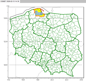 2. 13.02, godz. 16:00 – 14.02, godz. 06:00: kujawsko‑pomorskie – północ; pomorskie – całe; warmińsko‑mazurskie – zachód; wielkopolskie – północ; zachodniopomorskie – środkowa część regionu.