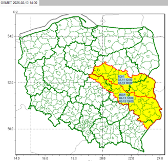 1. 11.02, godz. 12:00 – 13.02, godz. 19:00: lubelskie – całe; łódzkie – północny wschód; mazowieckie – centrum i południe; podkarpackie – powiat lubaczowski.