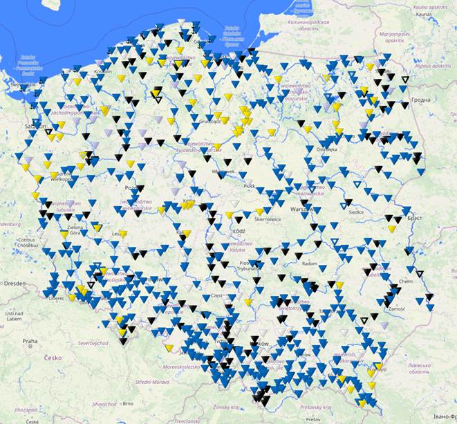Rys. 1. Stan wody na rzekach w Polsce, stan na godz. 14:00 dnia 13.02.2026 r.