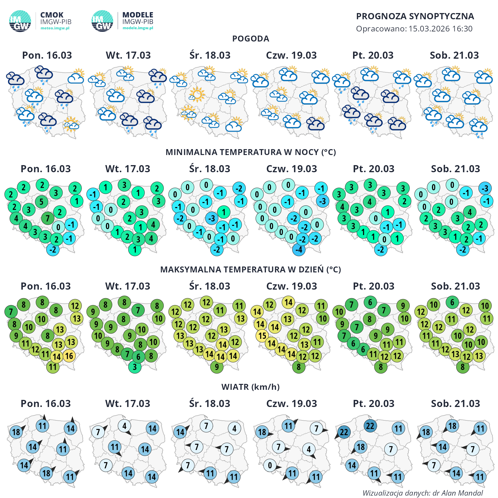 Stan na 15.03.2026, godz. 16:30 – opracowanie Centrum Meteorologicznej Osłony Kraju IMGW-PIB