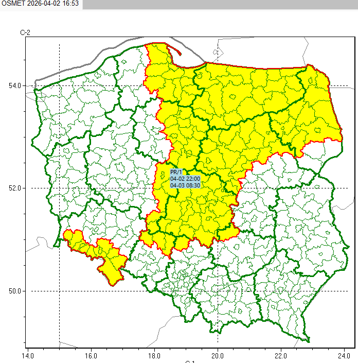 1. 02.04, godz. 22:00 – 03.04, godz. 08:30: dolnośląskie (południe i zachód), kujawsko‑pomorskie (większość), łódzkie (całe), mazowieckie (północ i zachód), opolskie (północ), podlaskie (większość), pomorskie (większość), śląskie (północ), świętokrzyskie (północ), warmińsko‑mazurskie (całe), wielkopolskie (wschód i południowy wschód).