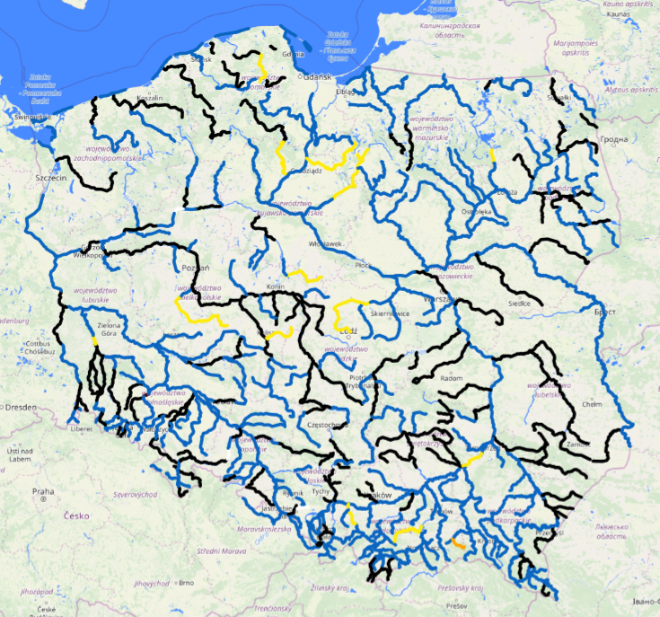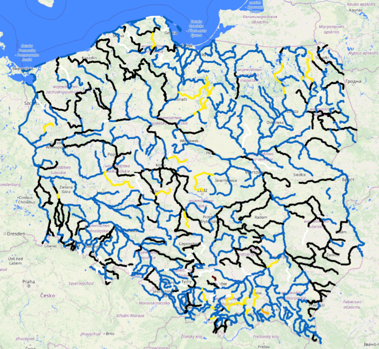Na rzekach w Polsce przeważa strefa stanów średnich (61% stacji hydrologicznych) oraz niskich (33%), lokalnie występują stany wysokie (6%) (rys. 1). W minionej dobie na większości rzek obserwowano stabilizację stanów wody oraz spadki. Niewielkie wzrosty, związane z przemieszczaniem się wody opadowej, zanotowano na mniejszych rzekach górskich w województwach małopolskim i śląskim, na ogół w strefie wody średniej.