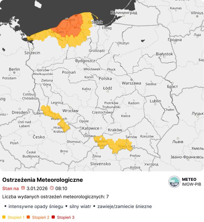 - woj. zachodniopomorskie i pomorskie: pas powiatów nadmorskich od gryfickiego po pucki oraz część Pomorza w głębi lądu: stopień 1 do godz. 18:00 dnia 3.01.2026