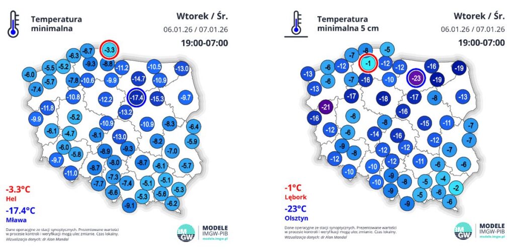 Rys. 2 Minimalna temperatura zanotowana w nocy wtorek/środa: na poziomie 2 m n.p.g. (z lewej) oraz przy gruncie 5 cm n.p.g. (z prawej).