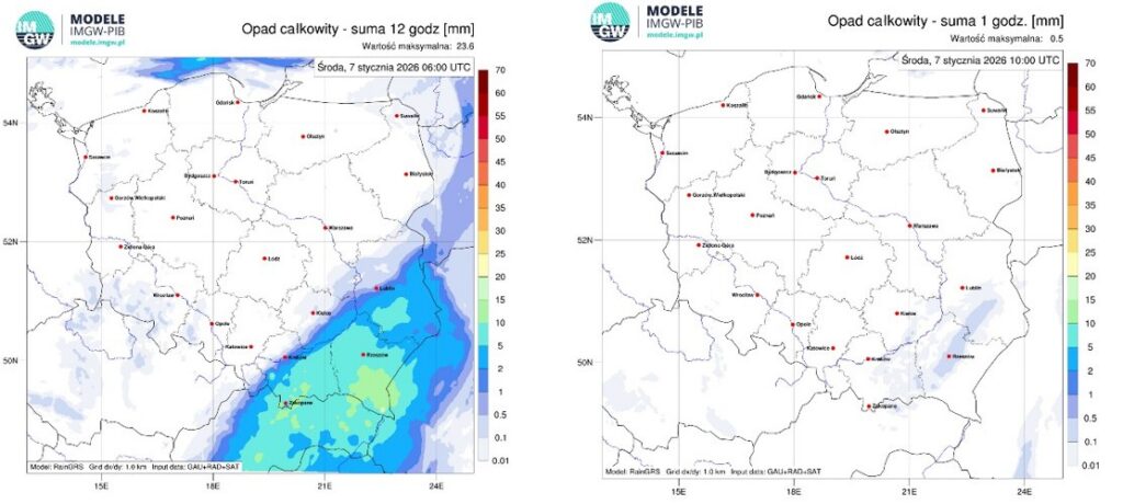 Rys. 3 Pole opadu atmosferycznego systemu RainGRS, oparty o pomiary radarowe, w połączeniu z siecią stacji pomiarowych i danych satelitarnych, w agregacji za okres nocy 6/7.01, od godz. 19:00 do godz 7:00 (z lewej) oraz z ostatniej godziny, od godz. 10:00 do godz. 11:00 (z prawej).