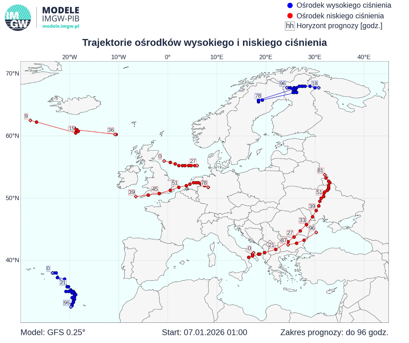 Rys. 5 Prognoza trajektorii ośrodków niżowych i centrów wysokiego ciśnienia w kolejnych dniach.
