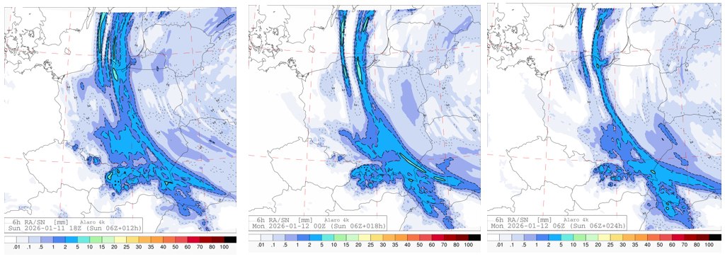 Rys. 4 Przykładowy rezultat prognozy opadu 6h śniegu (wyrażonego w jednostkach wodnego równoważnika śniegu) w symulacji modelu ALARO 4k0, za okres od 11.01 godz. 13:00 (cz. lok.) do 11.01 godz. 19:00 (z lewej), od 11.01 godz. 19:00 do 12.01 godz. 01:00