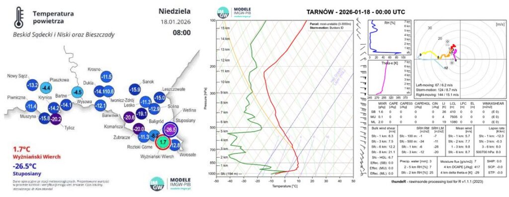 Rys. 2 Grafiki obrazujące wielkość inwersji w rejonie Bieszczadów. O godz. 08:00 w Stuposianach -26°C, a na położonym 913 m n.p.m. Wyżniańskim Wierchu 1,7°C. Po prawej diagram aerologiczny wykonany podczas pomiaru z godz. 01:00 dnia 18.01 w Tarnowie – czerwona linia oznacza temperaturę powietrza – najwyższa wartość około 5°C na wysokości około 700-800 m n.p.m.