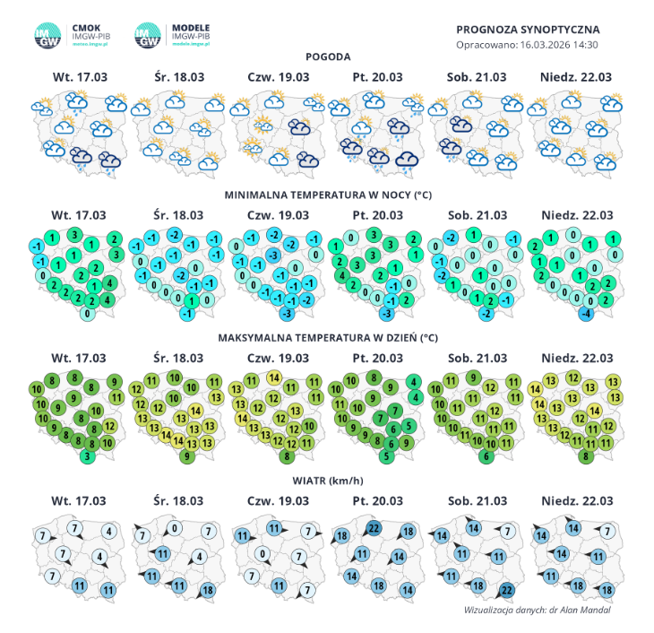 Rozpoczynający się tydzień przełomu kalendarzowej zimy i wiosny, przyniesie ochłodzenie w stosunku do poprzedzającego okresu. Pojawią się zarówno akcenty zimowe – opady śniegu i deszczu ze śniegiem – jak również słoneczne dni przywołujące na myśl wiosnę. Początek tygodnia będzie dość pochmurny, z opadami deszczu, deszczu ze śniegiem, a w górach śniegu. Później kontrolę nad pogodą przejmie wyż. Zrobi się słonecznie i ciepło. Od piątku powrócą opady deszczu, które będą występować w różnych regionach Polski również w weekend.