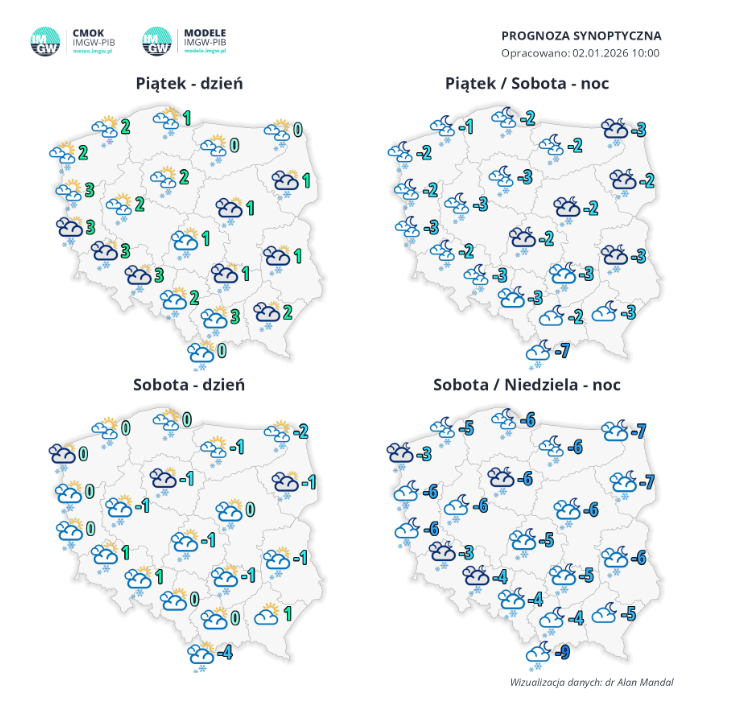 Zachmurzenie duże, możliwe większe przejaśnienia. Przelotne opady śniegu. Temperatura maksymalna od –4°C do –1°C. Wiatr umiarkowany, porywisty, południowo-zachodni i zachodni. Możliwe zawieje i zamiecie śnieżne.