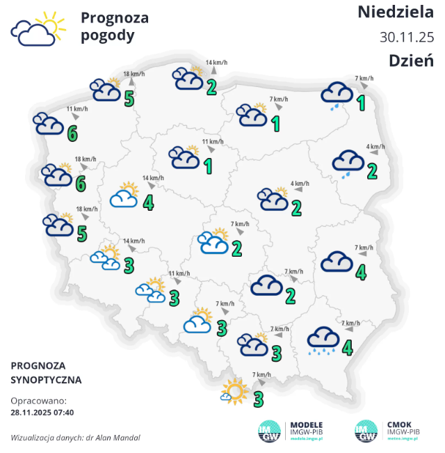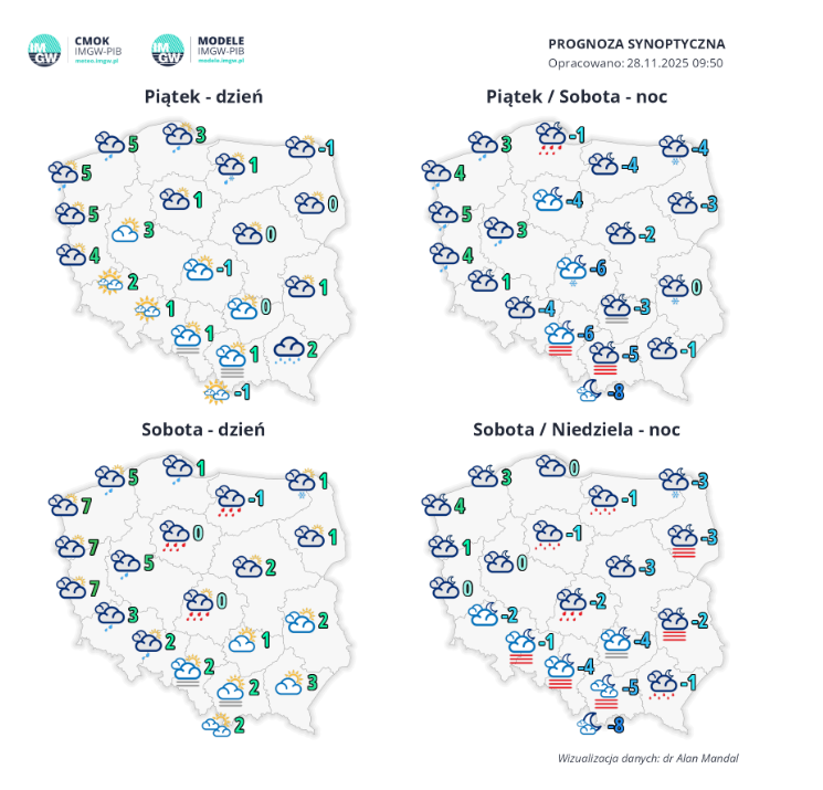 Rys.2 Synoptyczna prognoza pogody na weekend 28-30.11.2025
