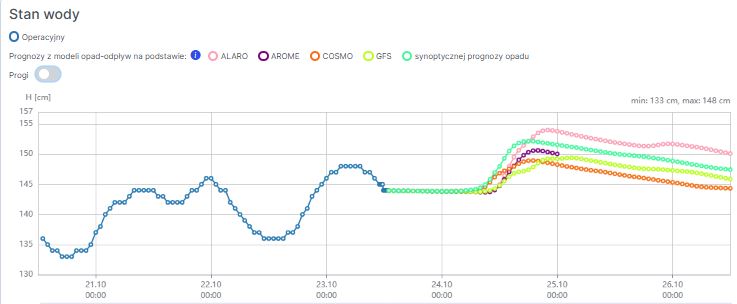 W serwisie hydrologicznym IMGW-PIB rozszerzyliśmy zakres prognoz dostępnych dla wszystkich użytkowników. Nowe rozwiązania umożliwiają analizowanie różnych scenariuszy rozwoju sytuacji hydrologicznej na podstawie prognoz opartych na modelach meteorologicznych: COSMO, ALADIN, ALARO i GFS.