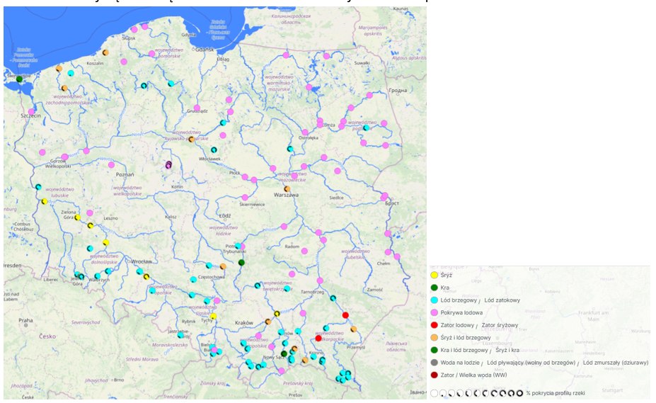 - Śryż i/lub lód brzegowy obserwowano lokalnie na Wiśle, Brynicy, Sole, Rabie, Dunajcu, Białej Tarnowskiej, Wisłoce, Sanie, Wisłoku, Supraśli i Orzycu.