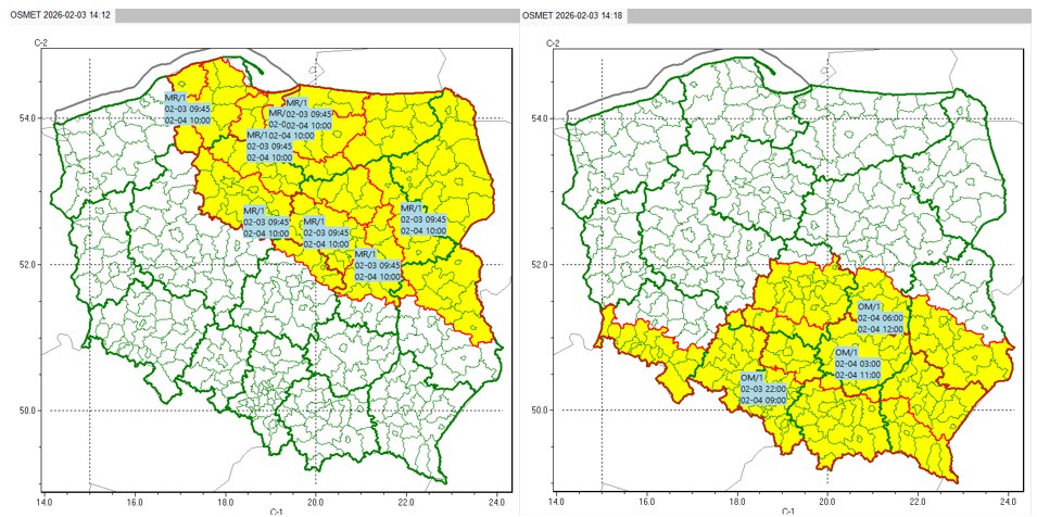 Rys. 1 Aktualne ostrzeżenia meteorologiczne nad Polską. Na tabliczkach oznaczone są: rodzaj zjawiska: MR – silny mróz, OM – opady marznące; po ukośniku stopień zagrożenia, w środkowej linii czas początku ważności, na dole czas końca ważności.