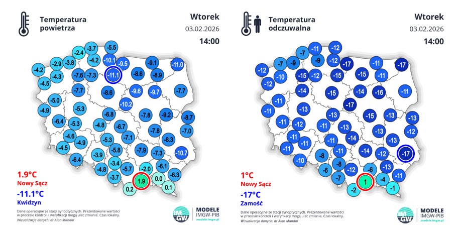 Rys. 2 Z lewej – temperatura powietrza zanotowana na stacjach IMGW-PIB. Z prawej: subiektywne odczucie temperatury obliczone na podstawie zmierzonych wartości temperatury i prędkości wiatru. Od południa widoczne ocieplenie – pierwsze stacje z dodatnią temperaturą powietrza.