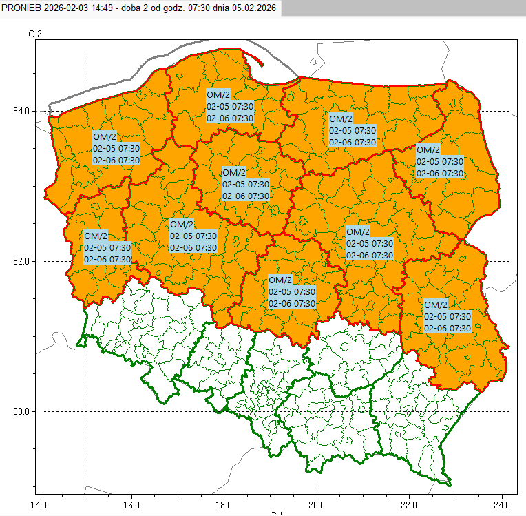 - Opady marznące/2: woj. lubuskie, zachodniopomorskie, wielkopolskie, kujawsko-pomorskie, pomorskie, łódzkie, mazowieckie, warmińsko-mazurskie, lubelskie i podlaskie. Wyższy stopień z uwagi na ryzyko opadów długotrwałych (powyżej 12 godzin).