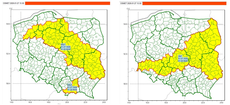 - Oblodzenie/1: lubuskie (południe), dolnośląskie, opolskie, wielkopolskie (południe).