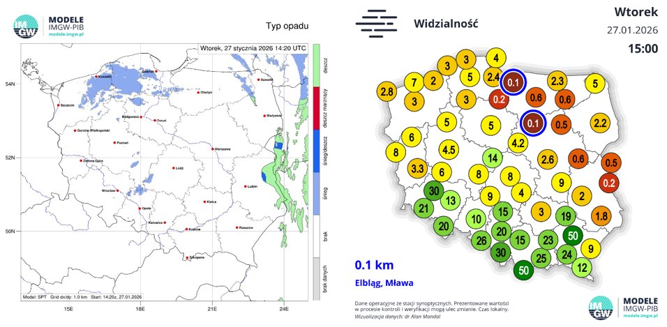 Sytuacja meteorologiczna (27.01.2026, stan na godz. 15:00)