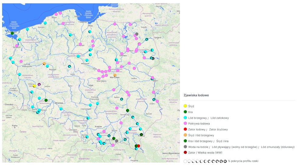 - Śryż i/lub lód brzegowy obserwowano lokalnie na Wiśle, Przemszy, Sole, Rabie, Dunajcu, Sanie, Wisłoku, Pilicy, Narwi, Supraśli, Biebrzy, Orzycu i Krznie.