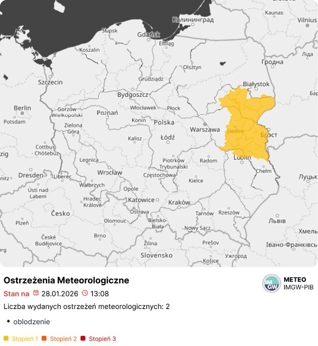 - Silny mróz/1: woj. zachodniopomorskie, pomorskie, warmińsko-mazurskie, podlaskie, wielkopolskie, kujawsko-pomorskie, łódzkie, mazowieckie, świętokrzyskie, lubelskie, małopolskie, podkarpackie.