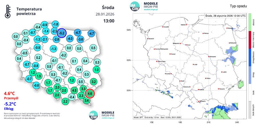 Sytuacja meteorologiczna (28.01.2026, stan na godz. 13:00)