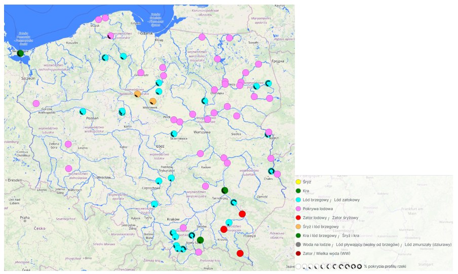 • Śryż i/lub lód brzegowy obserwowano lokalnie na Wiśle, Przemszy, Rabie, Dunajcu, Sanie, Wisłoku, Pilicy, Narwi, Supraśli, Orzycu i Krznie.