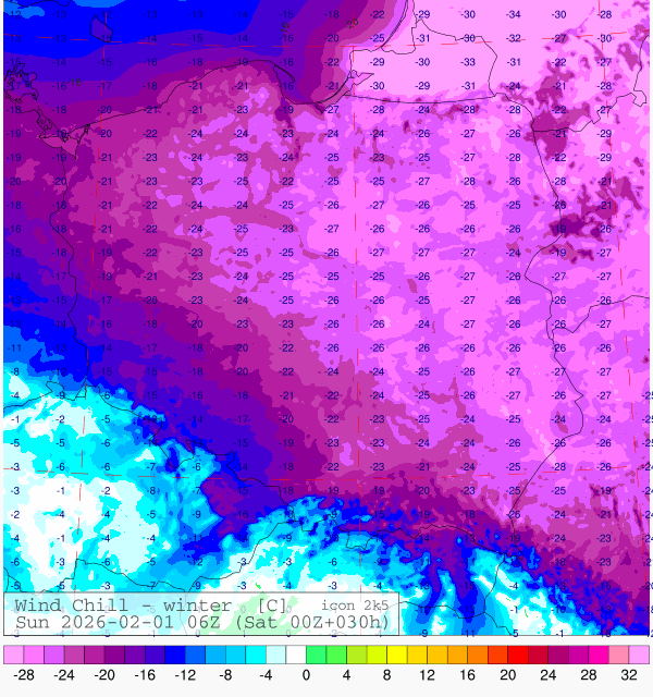 Minimalna temperatura w kolejnych dniach będzie jeszcze niższa. Największe spadki prognozowane są w nocy z niedzieli na poniedziałek i z poniedziałku na wtorek na Podlasiu i Lubelszczyźnie do –28°C, lokalnie w obszarach typowych dla silnych spadków temperatury w pogodne i bezwietrzne noce temperatura może sięgnąć nawet niemal -30°C (stopień trzeci ostrzeżenia kwalifikuje się, gdy prognozowana temperatura wynosi -30C lub poniżej). Dodatkowo, miejscami na Podlasiu temperatura może utrzymywać się poniżej -15°C łącznie nawet przez około 65–70 godzin (od niedzieli do wtorku).