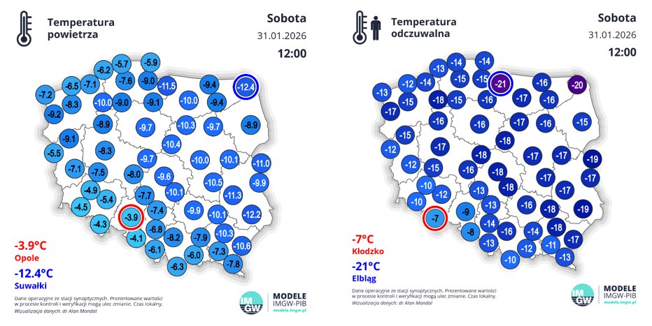 Nad północno-wschodnią połowę kraju napłynęło mroźne powietrze kontynentalne. W godzinach popołudniowych i wieczornych przejaśnienia będą sprzyjały silnemu wypromieniowaniu ciepła z podłoża i znacznemu spadkowi temperatury. W najbliższą noc temperatura minimalna na północnym wschodzie wyniesie od –24°C do –19°C, a temperatura odczuwalna może osiągać wartości odpowiadające od –30°C do –27°C.