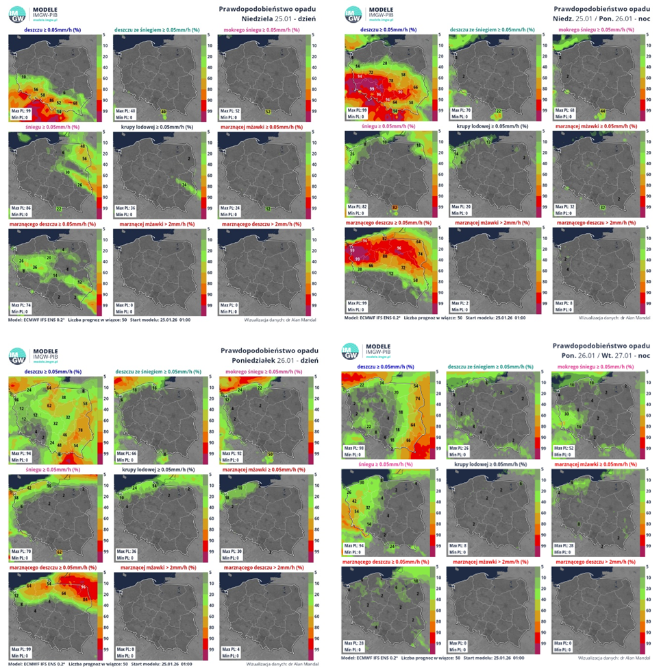 Rys.  3 Prawdopodobieństwo wystąpienia opadu danego typu w oparciu o statystyki wiązki symulacji numerycznego modelu ECMWF ENS na okres dnia w niedzielę (u góry z lewej), nocy z niedzieli na poniedziałek (u góry z prawej), dnia w poniedziałek (u dołu z lewej) i nocy z poniedziałku na wtorek (u dołu z prawej). Ze względu na dość złożony proces prognozy opadu marznącego należy te zobrazowania traktować poglądowo.