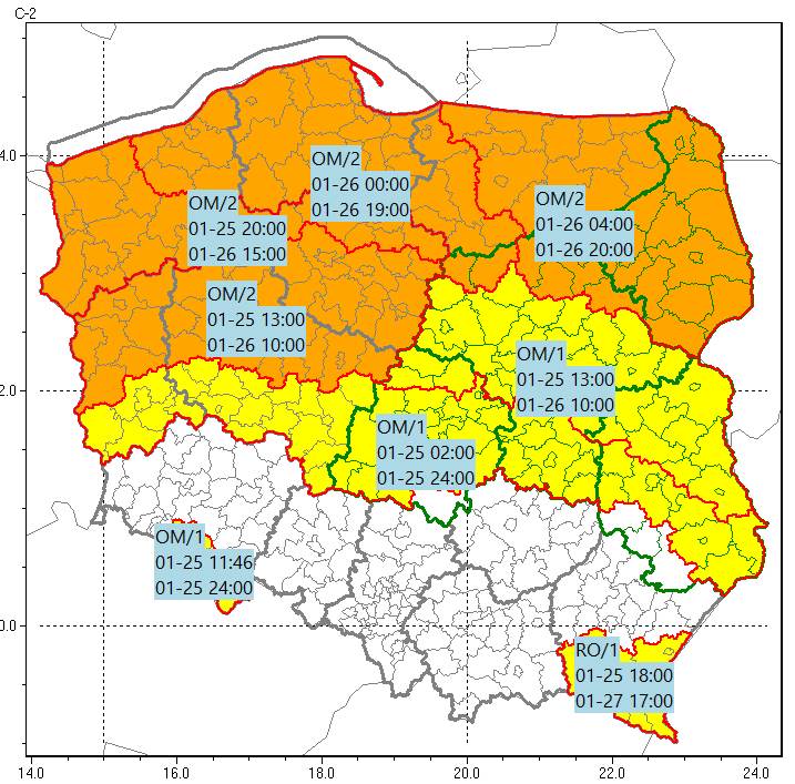 • Silny mróz/1: woj. podlaskie, warmińsko-mazurskie, pomorskie, kujawsko-pomorskie, łódzkie, świętokrzyskie, mazowieckie, lubelskie, podkarpackie.