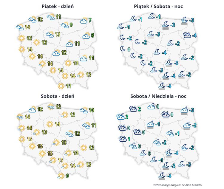 Początkowo bezchmurnie, później zachmurzenie małe i umiarkowane. Rano lokalnie silne zamglenia, a w rejonach podgórskich także zanikające mgły ograniczające widzialność do 300 m. Temperatura maksymalna od 13°C do 16°C, w rejonach podgórskich od 12°C do 15°C, wysoko w Beskidach od 6°C do 9°C, wysoko w Sudetach temperatura od 4°C do 6°C. Wiatr słaby, z kierunków południowych, po południu miejscami zmienny. Wysoko w górach wiatr słaby i umiarkowany, lokalnie porywisty, z kierunków południowych.