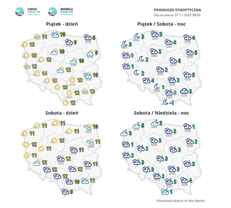 Rys. 2. Prognoza synoptyczna na weekend 07.11 – 09.11.2025 METEO IMGW-PIB | Serwis pogodowy