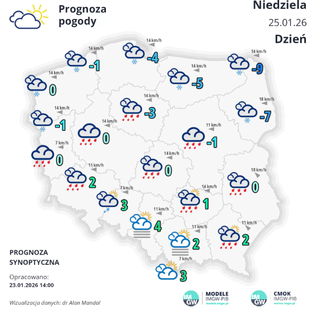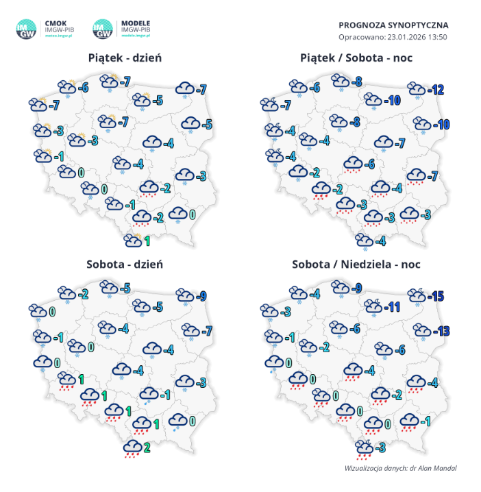 Zachmurzenie całkowite. Miejscami opady śniegu lub śniegu z deszczem, przejściowo opady marznącego deszczu lub mżawki powodujące gołoledź. Rano na wschodzie lokalnie mgła. Temperatura maksymalna od –1°C do 2°C. Wiatr słaby i umiarkowany, z kierunków wschodnich. W szczytowych partiach Sudetów (powyżej 1200 m n.p.m.) możliwe słabe opady śniegu. Temperatura od –6°C do –4°C, wiatr początkowo umiarkowany, później słaby, południowo-wschodni i południowy. Wysoko w Beskidach opady deszczu ze śniegiem i deszczu. Temperatura od –2°C do 1°C. Wiatr umiarkowany i dość silny w porywach do 65 km/h, południowo-zachodni.