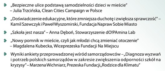 14:20 Seria wystąpień – Przykłady działań organizacji pozarządowych w obszarze zapewnienia zdrowej i bezpiecznej dla dzieci przestrzeni oraz odporności szkół