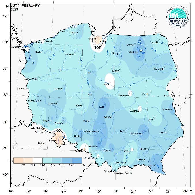 Obszarowo uśredniona suma opadu atmosferycznego w lutym 2023 r. wyniosła w Polsce 40,3 mm i była o 8,7 mm wyższa od normy dla tego miesiąca określonej na podstawie pomiarów w latach 1991-2020. Wg klasyfikacji Kaczorowskiej miniony luty należy zaliczyć do miesięcy bardzo wilgotnych (128 proc. normy).