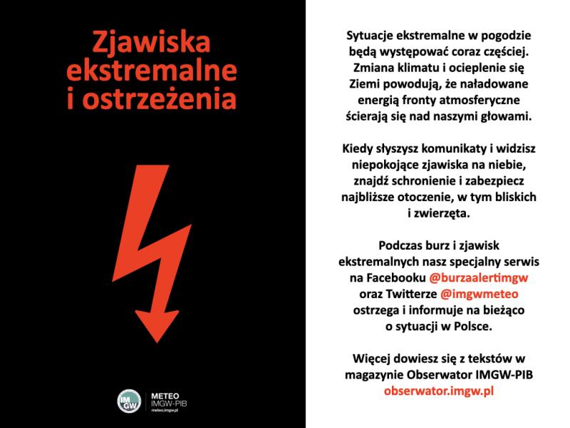 Kiedy słyszysz komunikaty i widzisz niepokojące zjawiska na niebie, znajdź schronienie i zabezpiecz najbliższe otoczenie, w tym bliskich i zwierzęta. Podczas burz i zjawisk ekstremalnych nasz specjalny serwis na Facebooku https://www.facebook.com/burzaalertimgw oraz Twitterze https://twitter.com/imgwmeteo ostrzega i informuje na bieżąco o sytuacji w Polsce. Więcej dowiesz się z naszego vademecum: https://obserwator.imgw.pl/burzowe-rekordy-i-bezpieczenstwo/