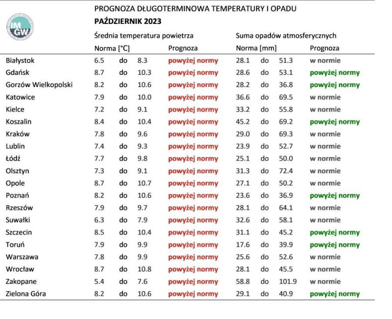 Tab. 4. Norma średniej temperatury powietrza i sumy opadów atmosferycznych dla października z lat 1991-2020 dla wybranych miast w Polsce wraz z prognozą na październik 2023 r.