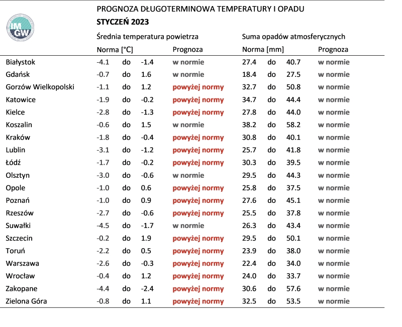 Tab. 3. Norma średniej temperatury powietrza i sumy opadów atmosferycznych dla stycznia z lat 1991-2020 dla wybranych miast w Polsce wraz z prognozą na styczeń 2023 r.