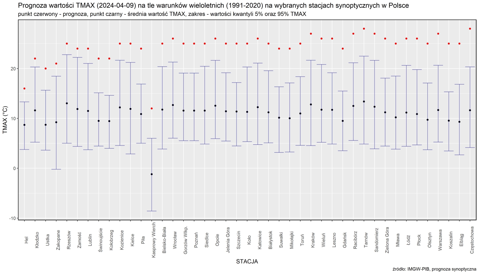 Tymczasem prognozy (z dnia 8 IV 2024) na 9 kwietna wskazują, że wartości temperatury maksymalnej (TMAX) w całym kraju będą wyższe niż przeciętnie. Na 41 stacjach spodziewać się można temperatury maksymalnej równej lub przekraczającej 20°C. Najwyższa wartość TMAX (28°C) wystąpi w Częstochowie i Tarnowie. Na wszystkich analizowanych stacjach (43) wartości dodatniej anomalii TMAX przekroczą 5°C. Najwyższa anomalia jest spodziewana w Częstochowie (+16,4°C). Prognozy synoptyczne wskazują, że na 43 stacjach wartości TMAX przekroczą wartości kwantyla 95% TMAX z wielolecia, przy czym należy zaznaczyć, że maksymalne przekroczenie oczekiwane jest w Koszalinie (+9,7°C). Z pewnym uproszczeniem można stwierdzić, że tak wysokie wartości TMAX notowane są na tych stacjach przeciętnie raz na 20 lat (prawdopodobieństwo przekroczenia wynoszące 5%).