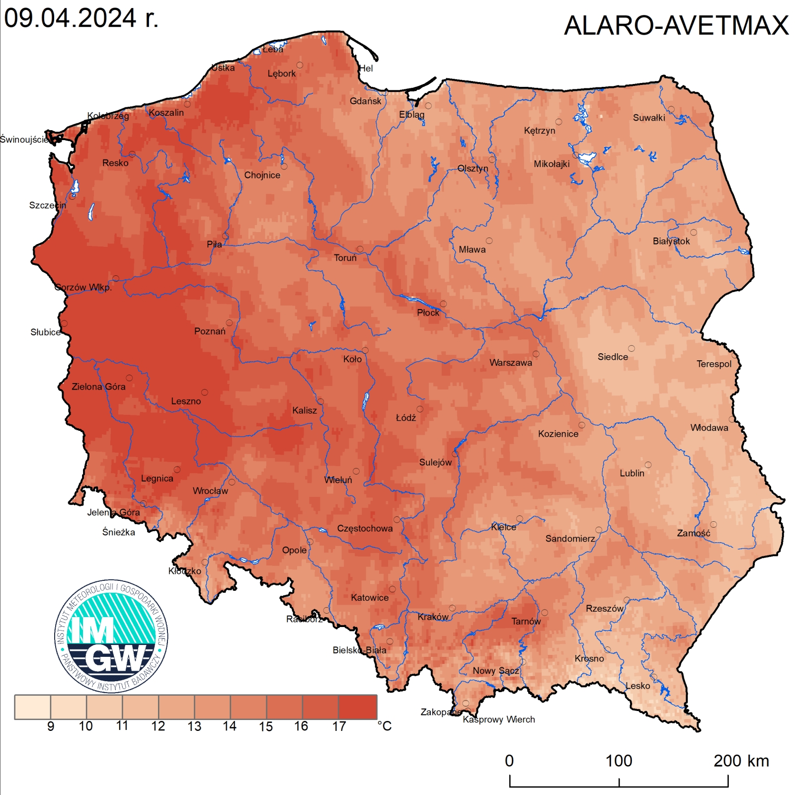 Prognoza wartości maksymalnej temperatury powietrza w dniu 09 kwietnia 2024 roku na tle warunków wieloletnich (1991-2020)
