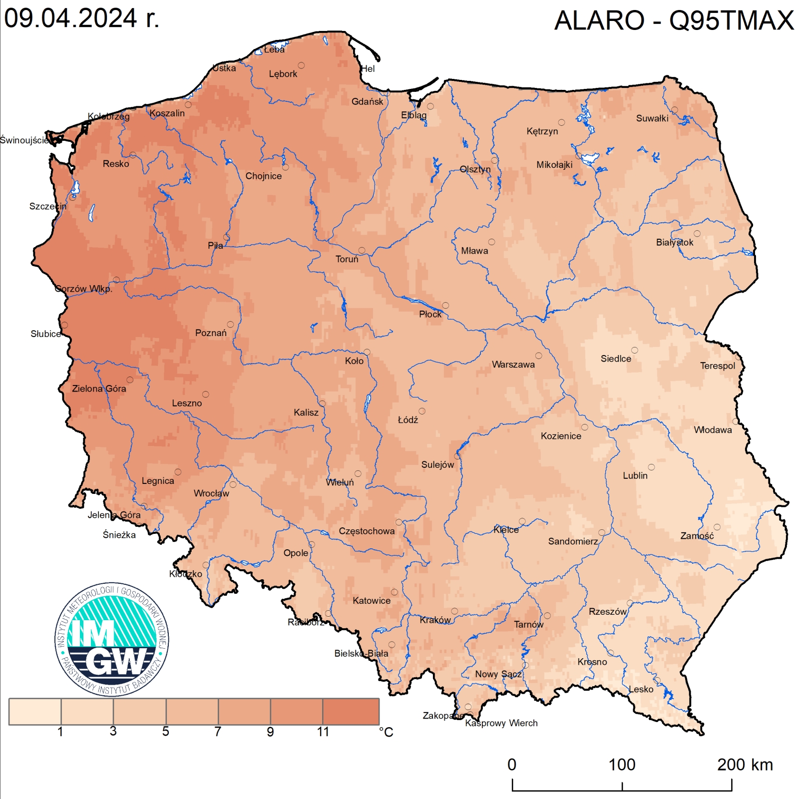 Porównanie prognozowanych wartości TMAX z modelu ALARO (prognoza z 8 IV 2024) z charakterystykami wieloletnimi pozwala stwierdzić, że na terenie całego kraju będziemy mieli do czynienia ze znacznym przekroczeniem wartości oczekiwanych. W zachodniej części kraju spodziewamy się dodatnich anomalii przekraczających +17°C. Analiza prognozy TMAX w odniesieniu do wartości 95% kwantyla z wielolecia, wskazuje, że na terenie całego kraju możemy spodziewać się wartości TMAX występującej rzadziej niż raz na dwadzieścia lat.